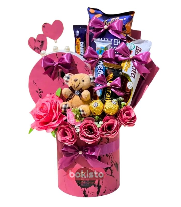 At the heart of this box is a soft teddy bear symbolizing warmth and affection. Surrounding it are decorative roses and assorted chocolates that enhance the emotional appeal. This thoughtful combination makes it one of the most searched teddy chocolate gift boxes in Lahore.
