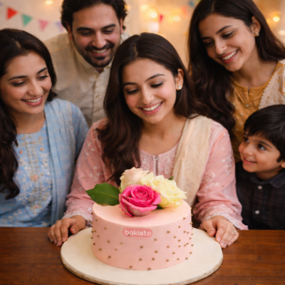 This cake features a smooth pastel pink finish, delicately decorated with real fresh roses and subtle golden bead detailing. The natural floral arrangement adds a premium and classy touch, making it perfect for girls, women, mothers, wives, sisters, and anyone who appreciates refined aesthetics. Whether you are celebrating at home or hosting a small party, this cake becomes a beautiful centerpiece.